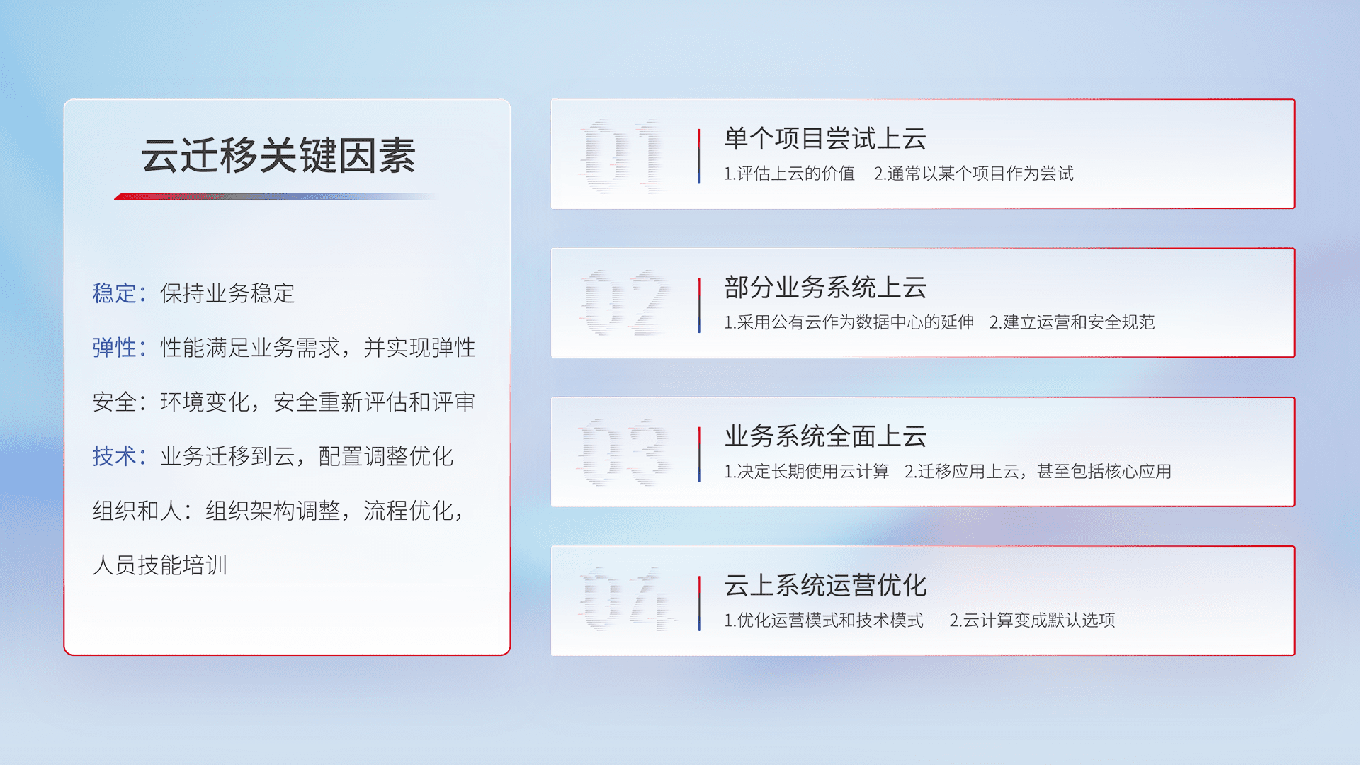 结合实际业务,,从规划设计、、、云平台选型、、、、云原生改造、、、、数据迁移、、集成交付,,迁移全过程为客户识别最佳上云路径,,,做好风险识别管理,,,,设计网络架构、、、身份权限、、、、安全审计合规、、、、操作审计、、日志审计、、、监控告警策略、、多站点容灾设计等,,对云上基础设施进行整体规划,,提升IT治理水平,,,以满足弹性、、、高可用、、高性能的需求。。。。