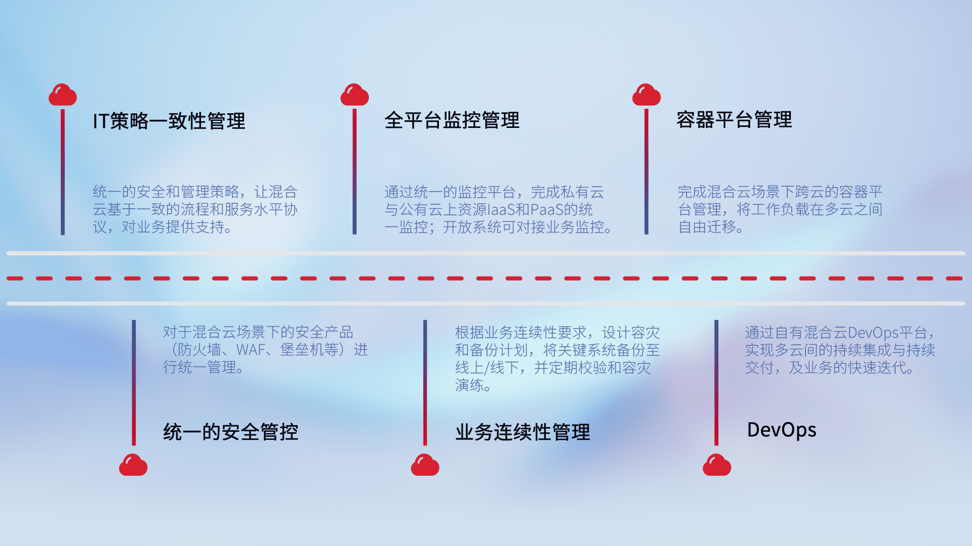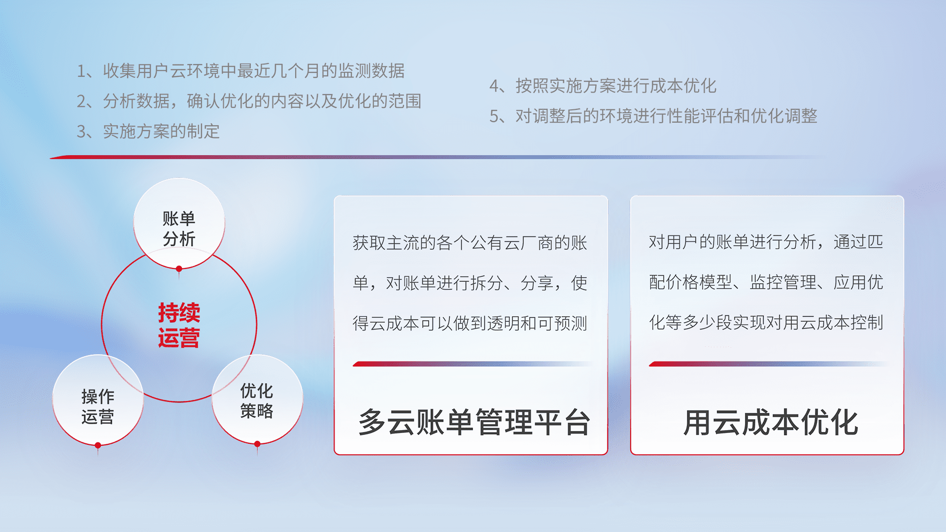 通过多云纳管,,,以统一的资源数据模型把客户的云资源进行抽象和封装,,进而实现对多云资源的统一操作,,,,保障云资源管理的可靠性、、、稳定性与可用性。。。量身定制化运维内容,,,,配置、、、、开发运维、、、补丁管理、、、备份、、、监控、、、、认证和访问管理、、、、审计和日常巡检等,,,保障在用云过程中的可靠度,,,,稳定度以及高可用率。。。。