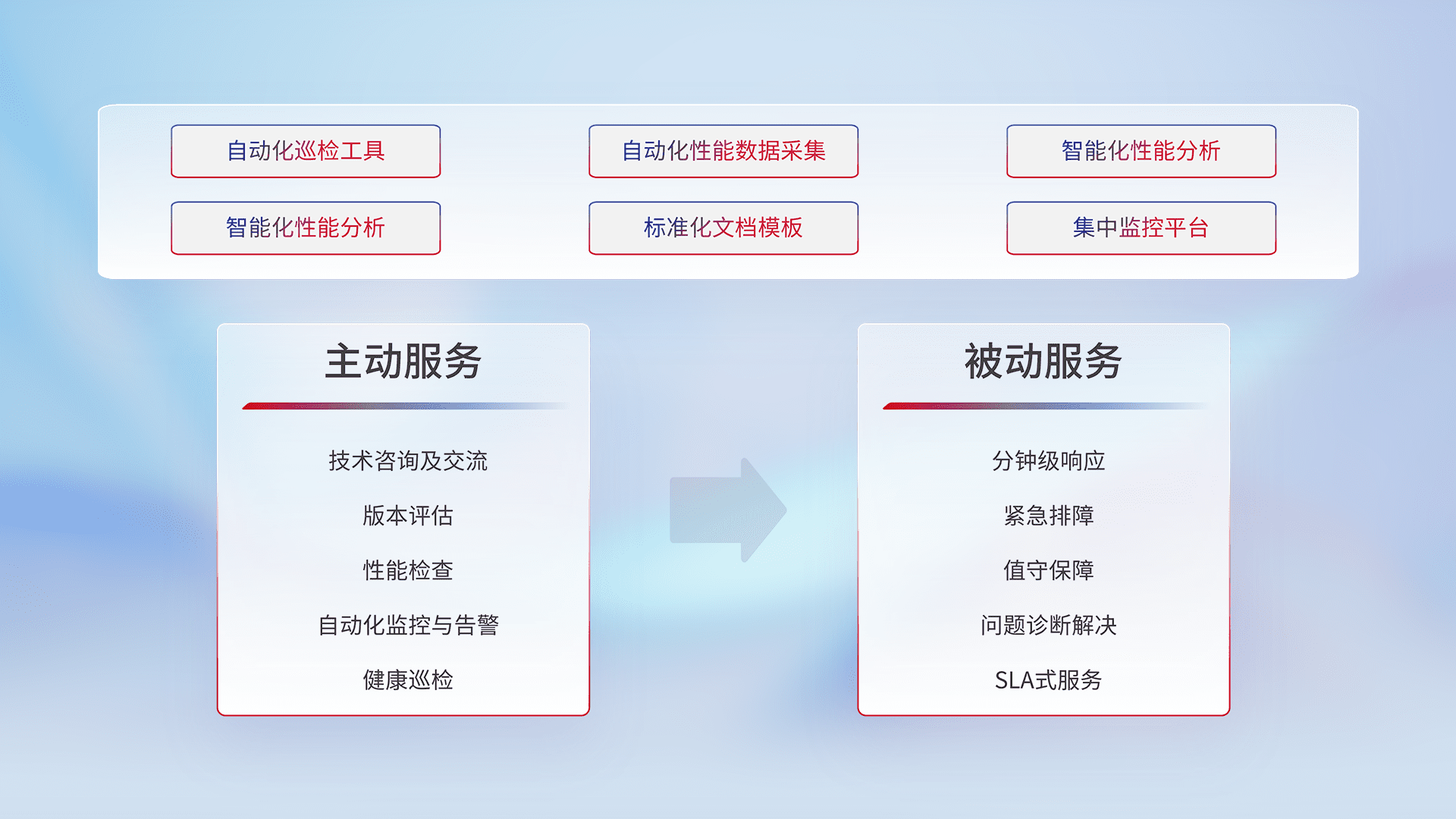 智能化工具和标准化文档,,,,保障服务质量,,提供主动服务(包含技术咨询、、版本评估、、、性能检查、、、自动化监控与告警、、、、健康巡检)和被动服务包含(分钟级响应、、紧急排障、、、值守保障、、问题诊断解决、、SLA服务)。。。。